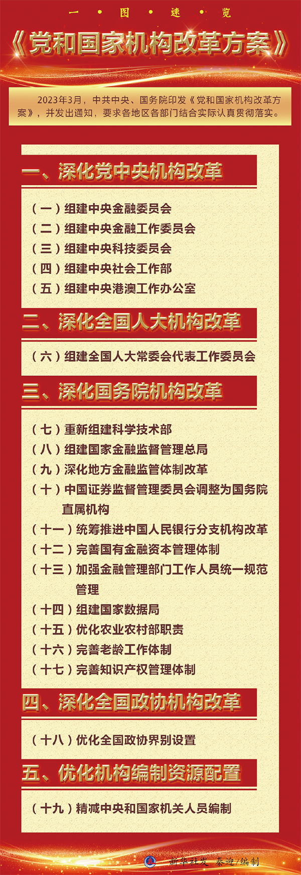 2023年3月10日上午9時許,北京人民大會堂大禮堂。2900多名全國人大代表按下表決器,十四屆全國人大一次會議表決通過了關于國務院機構改革方案的決定,批準了根據《黨和國家機構改革方案》形成的國務院機構改革方案。6天后,《黨和國家機構改革方案》全文公開發布,向著強國建設、民族復興的宏偉目標,黨和國家機構改革揚帆破浪啟新程。